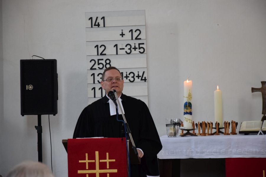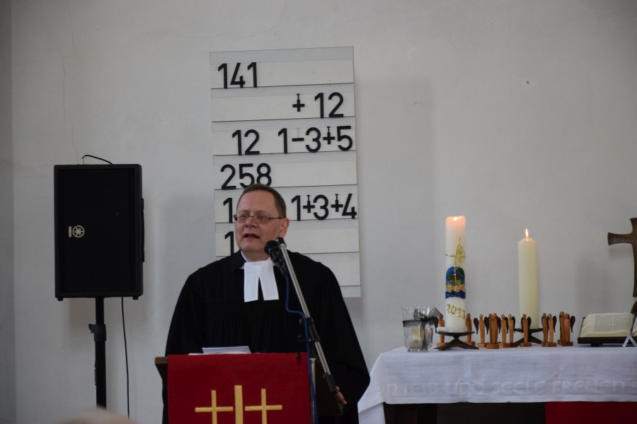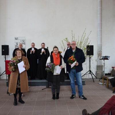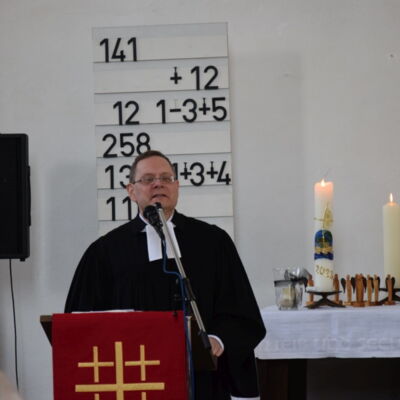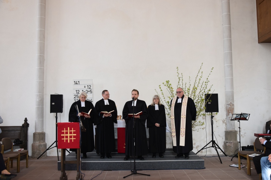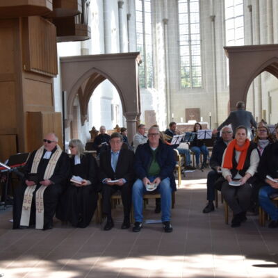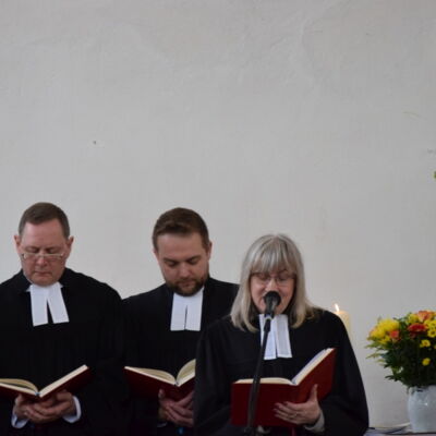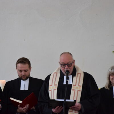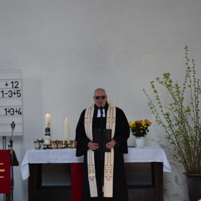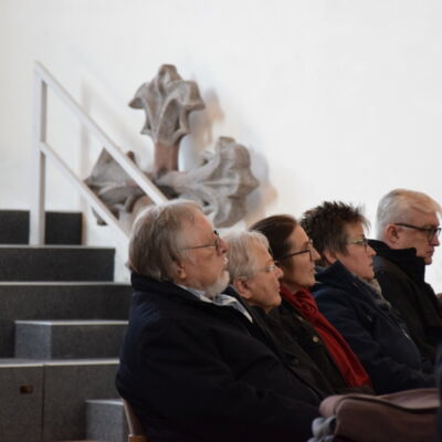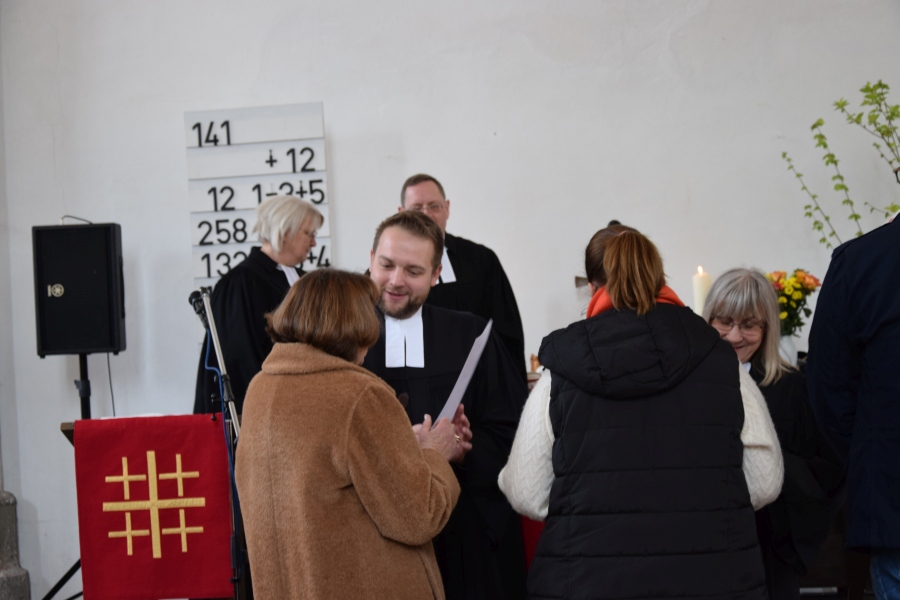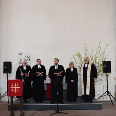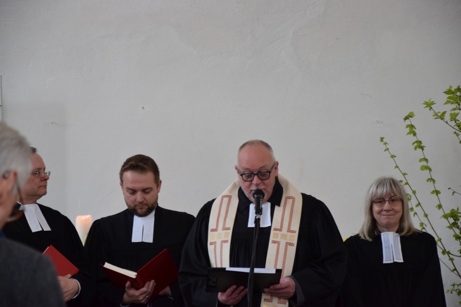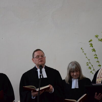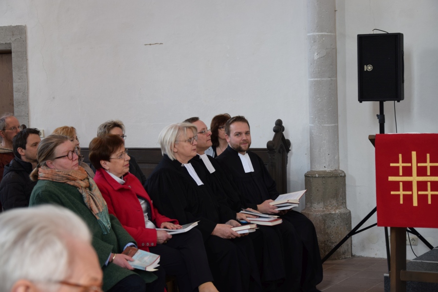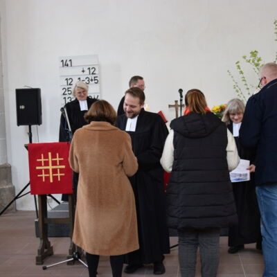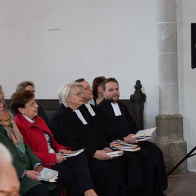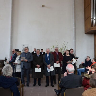Lieder und Texte standen unter dem Bild „Leib und Glieder“. In seiner Predigt blickte Pfr. Wirth auf die zu Ende gegangene Wahlperiode zurück und bat Gott um seinen Segen für den verantwortungsvollen Dienst des neuen Presbyteriums, das mit dem Pfarrteam zusammen das Schiff der Gemeinde durch die kommenden vier Jahre steuern wird. Vor der Einsegnung der neuen stand die Verabschiedung der ausscheidenden Presbyterinnen und Presbyter: Sandra Dierkes, Ekkehard Hemesoth, Tobias Korte und Petra Paulokat-Helling, mit großem Dank, starkem Applaus und einem Blumenstrauß! Anschließend trafen sich alle Teilnehmer im Gemeindehaus zu angeregtem Gespräch.