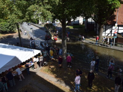 Ich nehme Sie, liebe Leserin und lieber Leser mit auf einen kleinen Spaziergang durch Bruchhausen. Kommen Sie, wir starten gemeinsam an der Nethebrücke, an dem sonnigen Sonntag, dem ersten im September dieses Jahres und schlendern das Kopfsteinpflaster der Hauptstraße so 120 Meter entlang, vorbei an einer Straßenabsperrung, bis wir 200 Meter weiter auf den Grund der Absperrung treffen. Unseren ganzen Weg lang begleiten uns links und rechts der Straße die bruchhausentypischen Gehwege, deren kniehohe Absturzkante durch ein Geländer gesichert ist. Und hier vor dem katholischen Kirchplatz haben eifrige Menschen für das heutige ökumenische Pfarr- und Gemeindefest einen Damm aus Strohballen zwischen den hohen Bürgersteigen quer über die Straße errichtet. Und ist dies noch nicht seltsam genug, haben die da die ganze Straße mit dem Wasser des Silberbachs geflutet. Ich lenke Ihren Blick auf die Wasseroberfläche, „damit ihr begreifen könnt, welches die Breite und die Länge und die Höhe und die Tiefe ist“. Nämlich Breite der Wasserfläche: 7,20 m; Länge: 70 m; Tiefe: bis 60 cm; Höhe der aufgestellten Pritsche: 4 m.