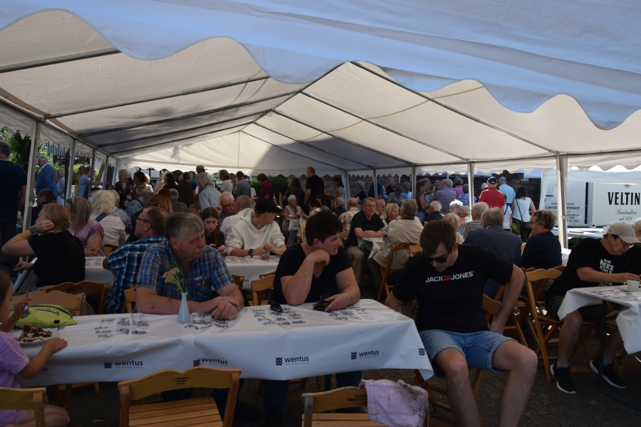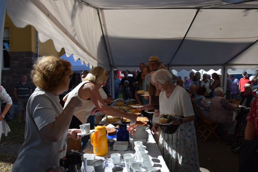 So gehen wir zwischen den aufgestellten Zelten hindurch. Ein großes für das Kuchenbuffet und mit zahlreichen Sitzmöglichkeiten, eines, wo später Bratwurst und Pommes angeboten werden sowie ein weiteres kleines mit gekühlten Getränken und Salaten. Ach ja, dahinter ist auch noch eine Hüpfburg, gar nicht mal so klein, zu erkennen. Aber halten wir uns nicht so lange auf, die Kirche ist schon gut gefüllt – Sie wollen ja noch einen guten Platz bekommen.
