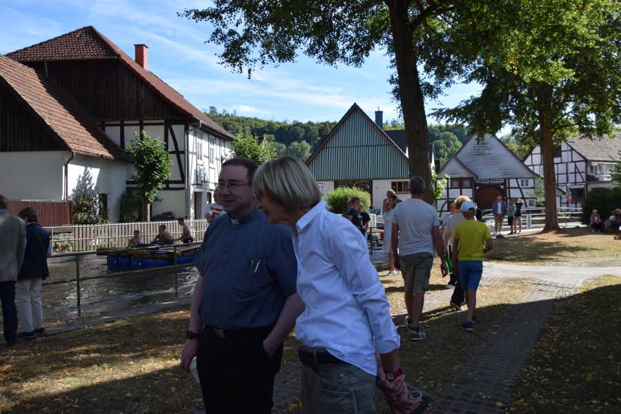 Dann erklingt der Posaunenchor Bruchhausen und Pfarrdechant Dr. Krismanek eröffnet den ökumenischen Gottesdienst. Pfarrer Gunnar Wirth hält die Ansprache über Eph 3, 17b – 19a: „Und ihr seid in der Liebe eingewurzelt und gegründet, damit ihr mit allen Heiligen begreifen könnt, welches die Breite und die Länge und die Höhe und die Tiefe ist, auch die Liebe Christi erkennen könnt, die alle Erkenntnis übertrifft.“ Er spricht von „neuen Dimensionen“ und davon, dass wir „die Liebe Christi erhaschen“ können, denn „sie ist wirklich da“. „Und heute, wenn wir miteinander feiern und essen und trinken und erzählen und zuhören und lachen und nachdenken, da mag davon auch etwas ans Tageslicht kommen. Wie der verrohrte Silberbach.“