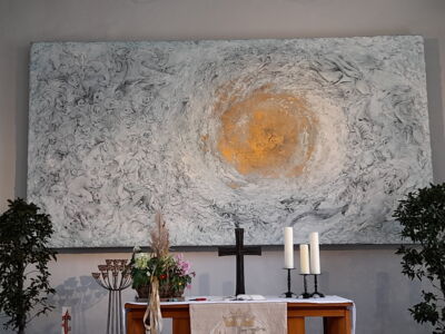 Die Exkursion startete in der kleinen Kirche von Heinsen. Wenn man das Kirchenschiff betritt, wird der Blick gleich vom Altarbild aus dem Jahre 2014 mit dem Titel „Genesis“ angezogen. Auf einer Fläche von 2.30 m x 4,40 m erkennt man einen goldenen Kreis in der Mitte und helles „Gewimmel“ drum herum. Beim Näherkommen sieht man dann immer mehr: Tiere unterschiedlichster Art sowie Adam und Eva sind spiralförmig um diesen Kreis angeordnet. Es ist wirklich faszinierend, wie das Bild in die Kirche passt und wie man immer mehr erkennt, je öfter man hinschaut.