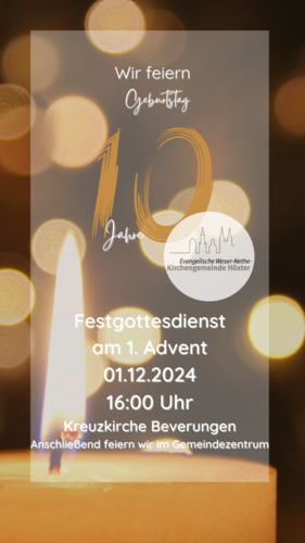 Am 1. Adventssonntag, dem 1.12.2024 beginnt für die Evangelische Weser-Nethe-Kirchengemeinde das 11. gemeinsame Kirchenjahr. Aus diesem Anlass lädt die Gemeinde alle Mitglieder, aber auch Freunde und ökumenische Begleiter der Gemeinde, zu einem gemeinsamen Festgottesdienst um 16:00 Uhr in der Kreuzkirche Beverungen ein. Im Anschluss wird im benachbarten Gemeindezentrum miteinander gefeiert.