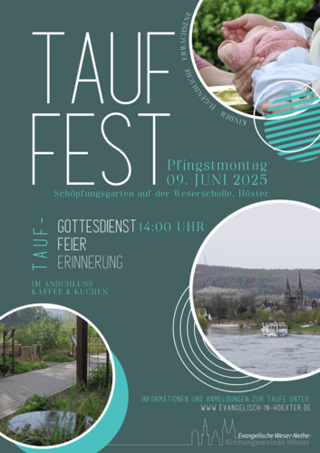 Am Pfingstmontag feiern wir endlich wieder ein großes Tauffest an der Weser. Mehr als 30 Kinder werden an vier Orten rund um den Schöpfungsgarten getauft, anschließend wird mit Kaffee und Kuchen auf der Weserscholle gefeiert.