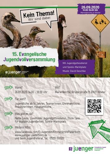 es ist wieder so weit, die 15. Evangelische Jugendvollversammlung findet statt am Samstag, den 26.09.2020 in der Marienkirche Höxter, Brüderstraße 9, 37671 Höxter in der Zeit von 14.00 - 18.00 Uhr.