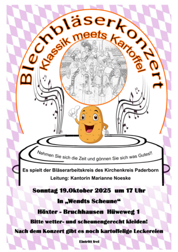 Am Sonntag, den 19. Oktober veranstaltet der Bläser-Arbeitskreis des Kirchenkreises Paderborn ein Konzert um 17 Uhr in Höxter-Bruchhausen. Auf dem Programm stehen Texte und Musik rund um das Thema „Klassik meets Kartoffel“.