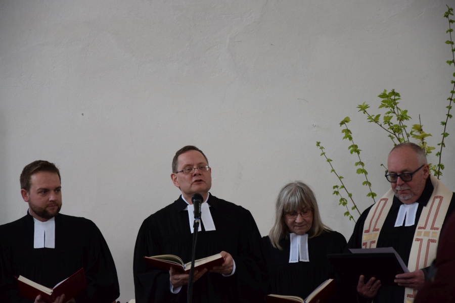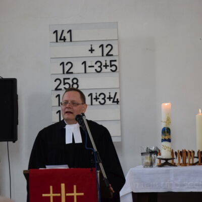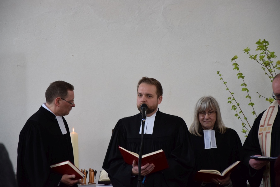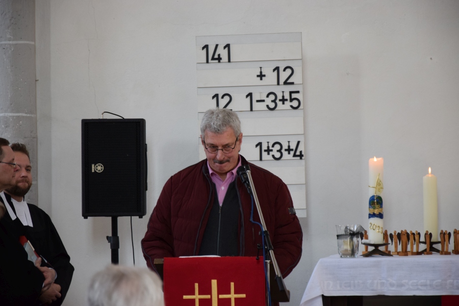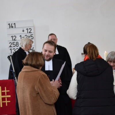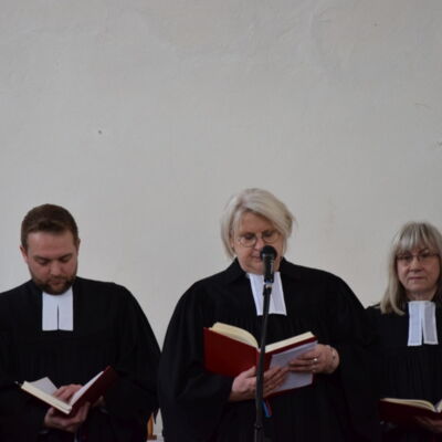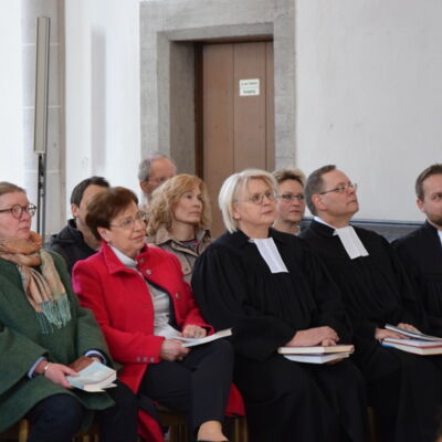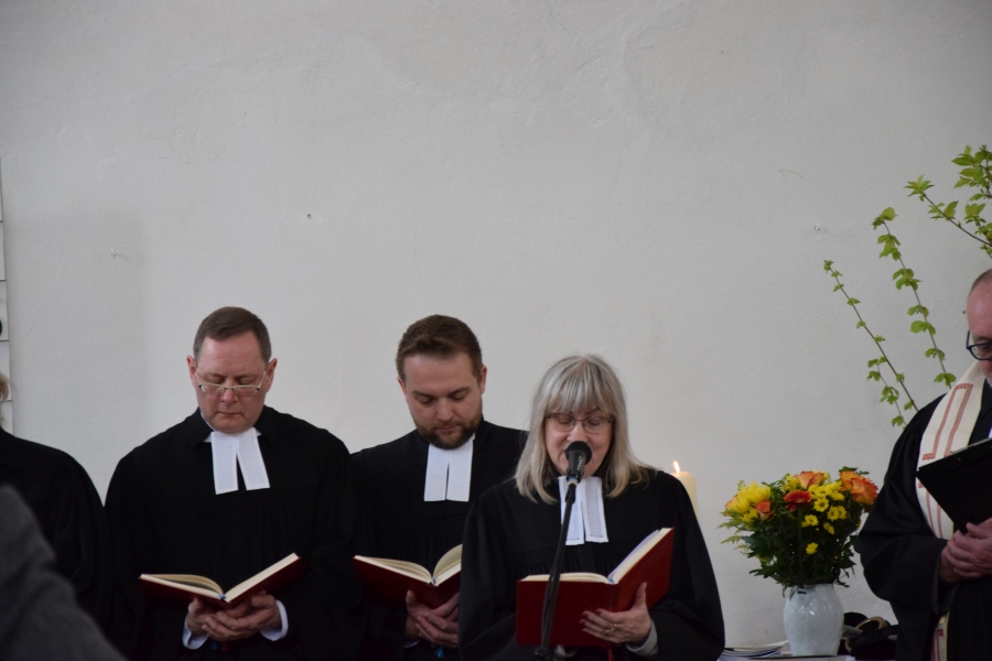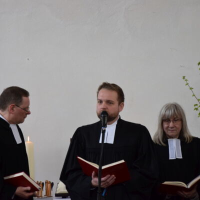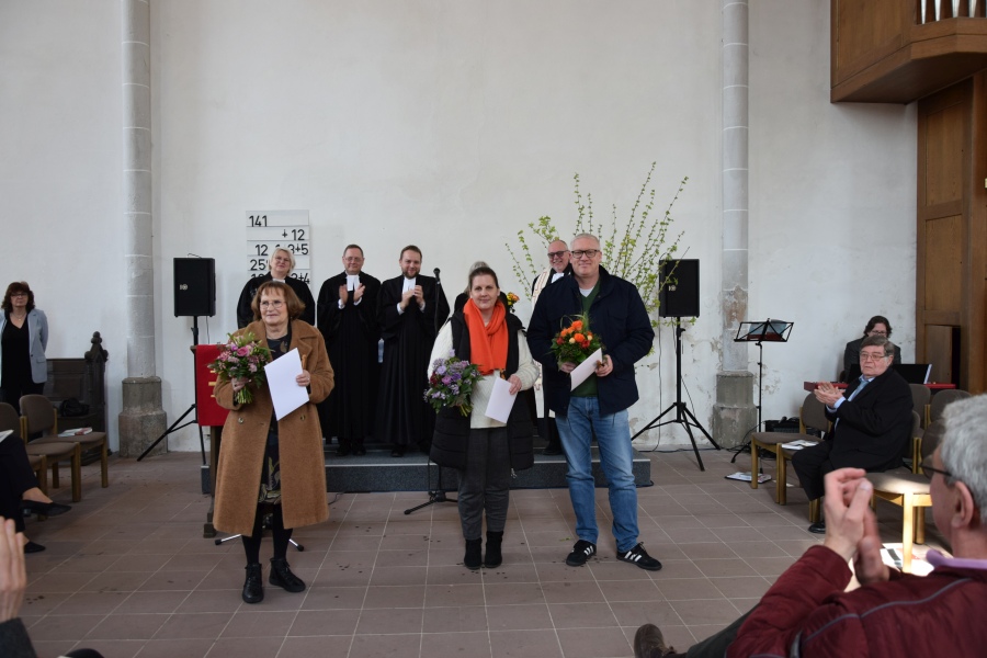 Lieder und Texte standen unter dem Bild „Leib und Glieder“. In seiner Predigt blickte Pfr. Wirth auf die zu Ende gegangene Wahlperiode zurück und bat Gott um seinen Segen für den verantwortungsvollen Dienst des neuen Presbyteriums, das mit dem Pfarrteam zusammen das Schiff der Gemeinde durch die kommenden vier Jahre steuern wird. Vor der Einsegnung der neuen stand die Verabschiedung der ausscheidenden Presbyterinnen und Presbyter: Sandra Dierkes, Ekkehard Hemesoth, Tobias Korte und Petra Paulokat-Helling, mit großem Dank, starkem Applaus und einem Blumenstrauß! Anschließend trafen sich alle Teilnehmer im Gemeindehaus zu angeregtem Gespräch.