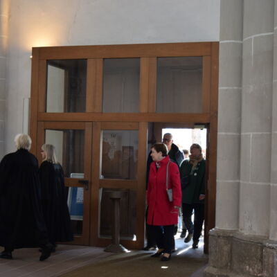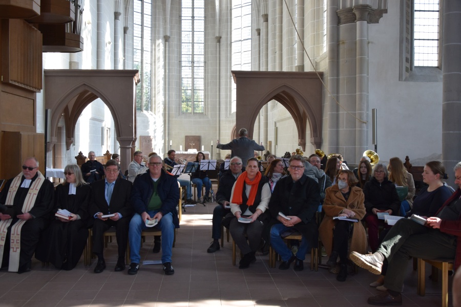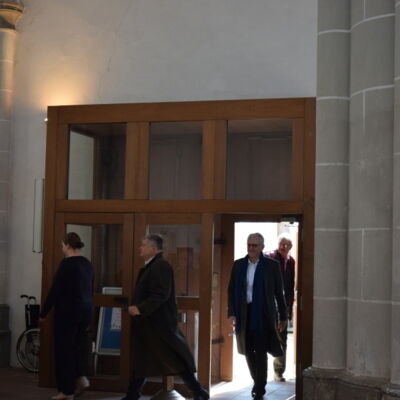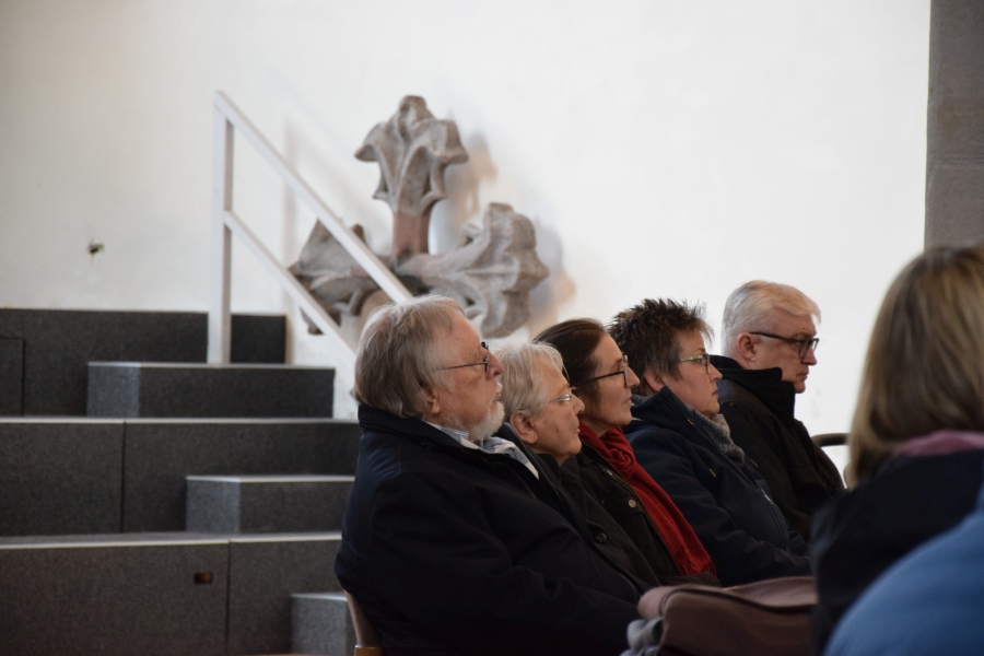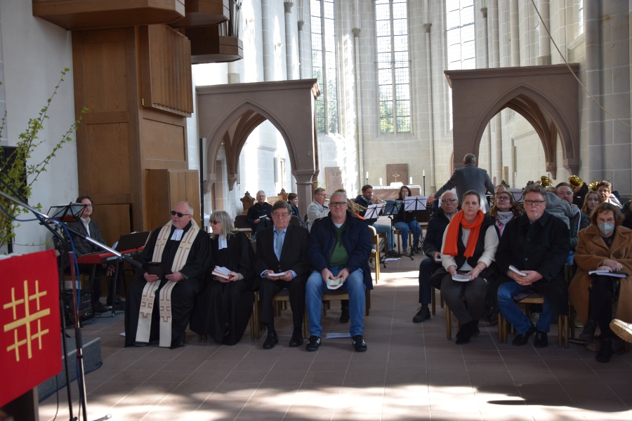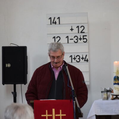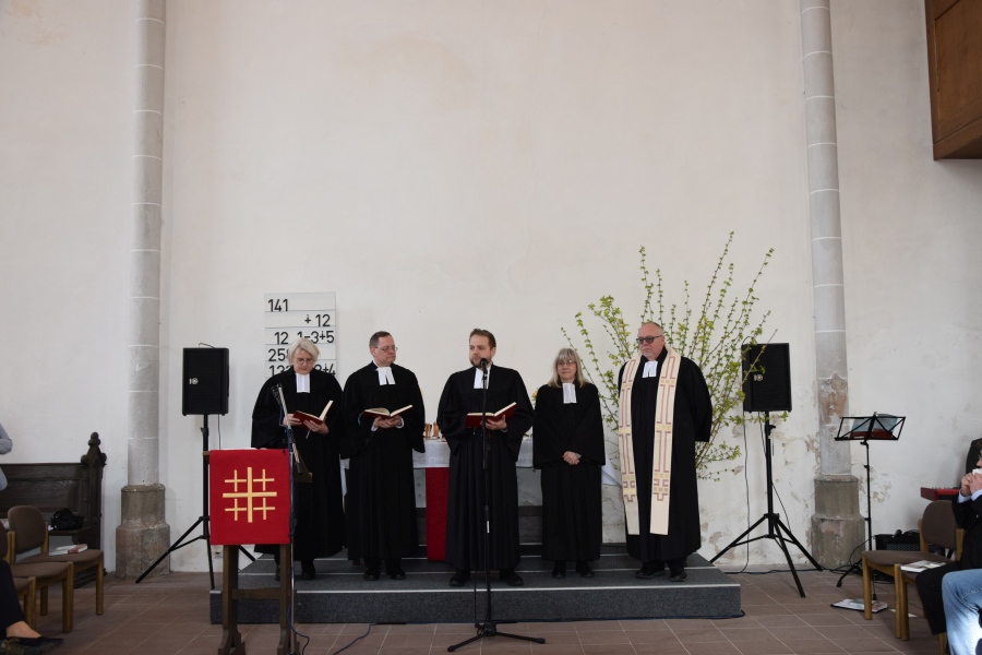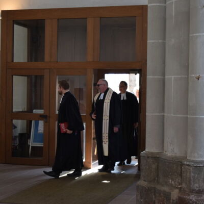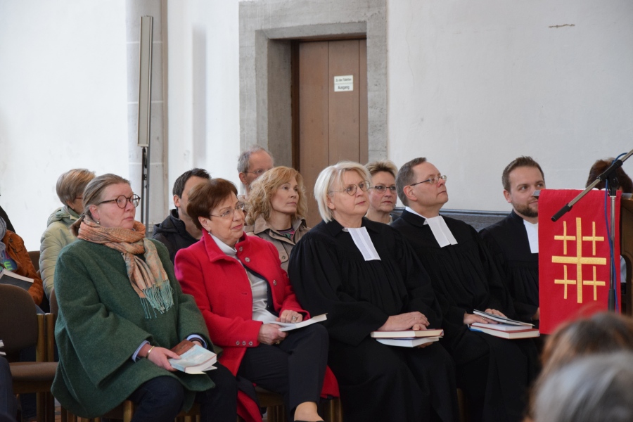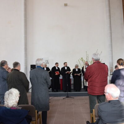 Lieder und Texte standen unter dem Bild „Leib und Glieder“. In seiner Predigt blickte Pfr. Wirth auf die zu Ende gegangene Wahlperiode zurück und bat Gott um seinen Segen für den verantwortungsvollen Dienst des neuen Presbyteriums, das mit dem Pfarrteam zusammen das Schiff der Gemeinde durch die kommenden vier Jahre steuern wird. Vor der Einsegnung der neuen stand die Verabschiedung der ausscheidenden Presbyterinnen und Presbyter: Sandra Dierkes, Ekkehard Hemesoth, Tobias Korte und Petra Paulokat-Helling, mit großem Dank, starkem Applaus und einem Blumenstrauß! Anschließend trafen sich alle Teilnehmer im Gemeindehaus zu angeregtem Gespräch.