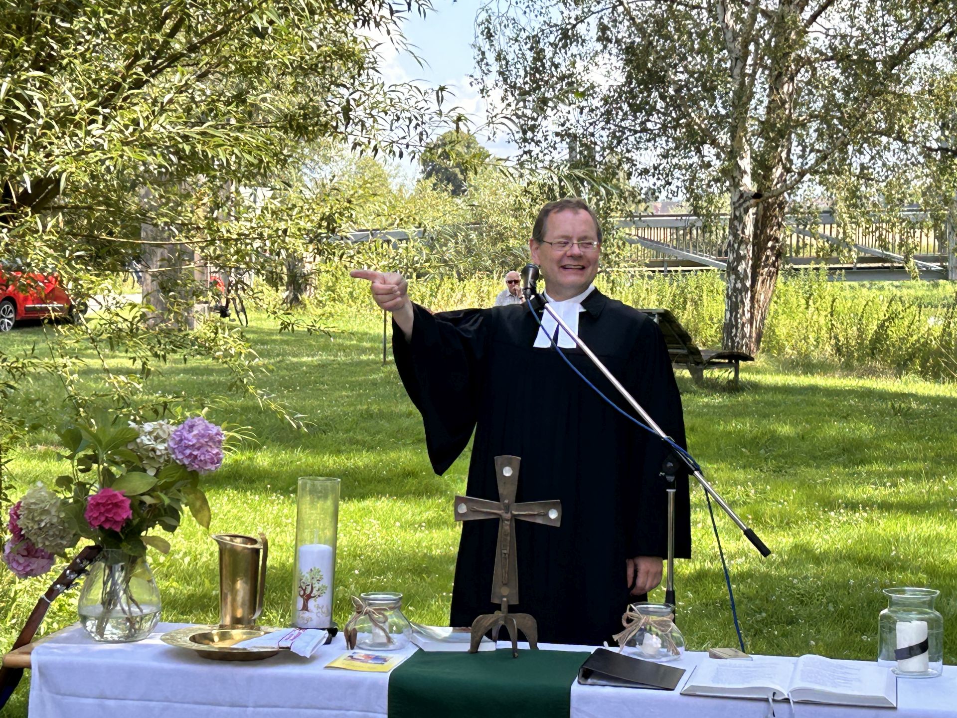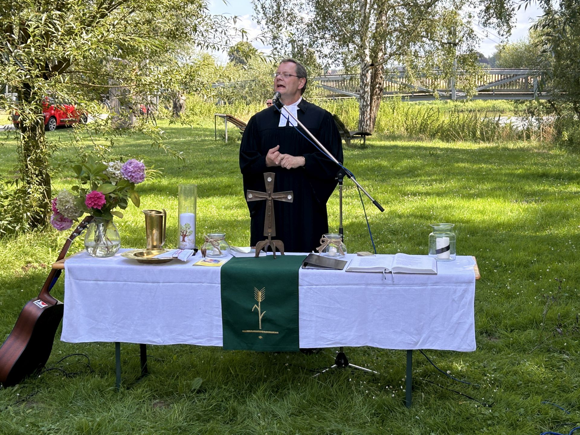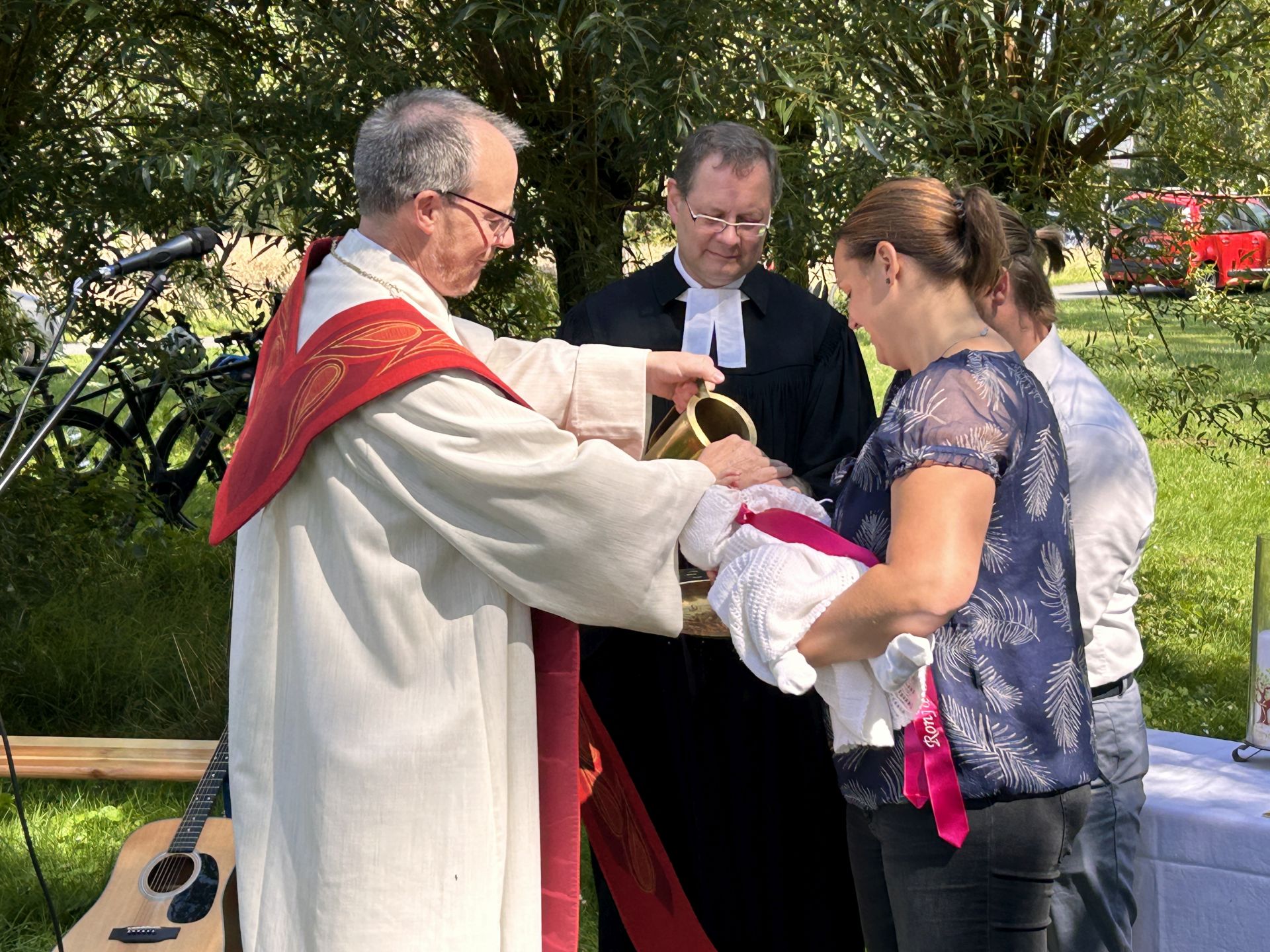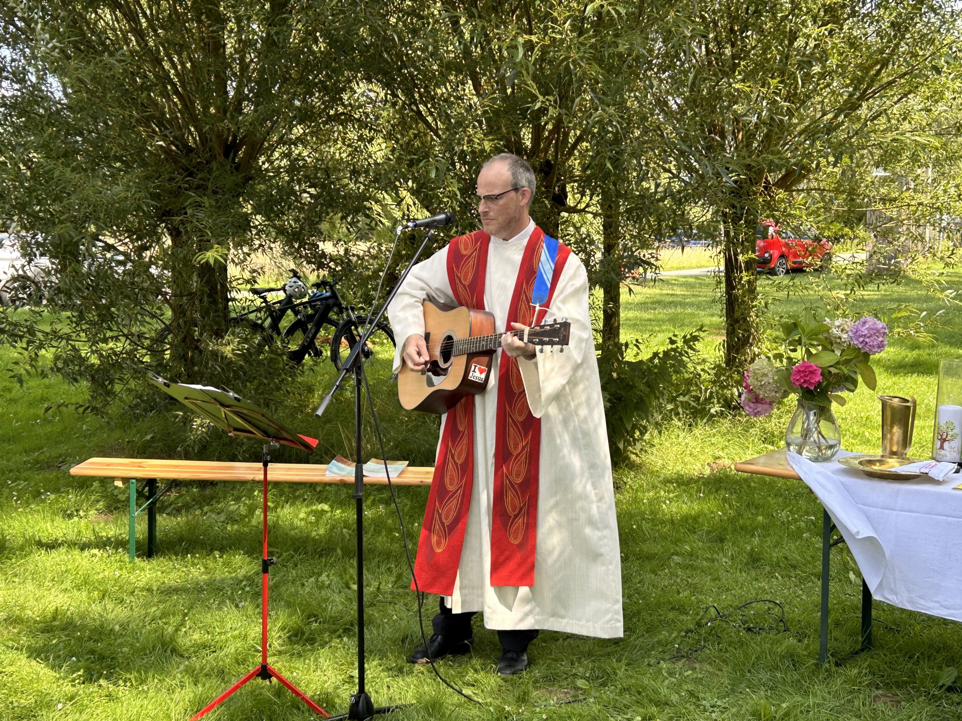 Pfarrer Gunnar Wirth eröffnete um 11.00 Uhr den Gottesdienst und konnte zu seiner Freude weit über 120 Gläubige begrüßen. Ein besonderes Ereignis war heute die Taufe eines Kindes, dass in der Gemeinschaft der Gemeinde mit Nethewasser getauft wurde. Die Taufe symbolisiert die Reinigung von Sünden und das neue Leben in Christus. Durch Musik und Gesang lobten die Anwesenden Gott. Nach dem Gottesdienst lud Pfarrer Gunnar Wirth zum Plausch bei Kaffee und Mineralwasser ein. Besonders Danke sagen wir allen Helferinnen und Helfern. Ohne eure Hilfe könnten wir so bewegende und schöne Gottesdienste in der freien Natur nicht feiern!