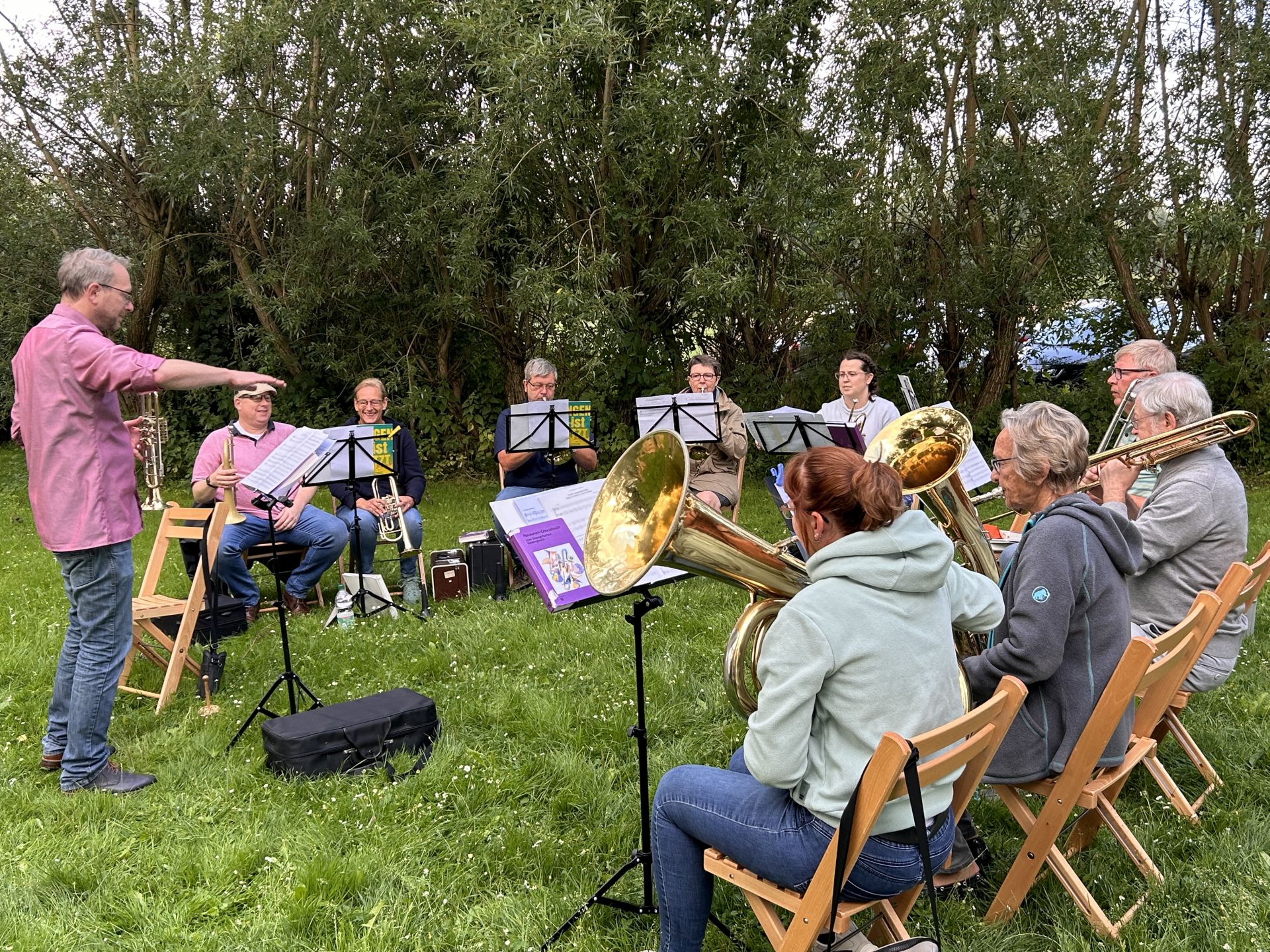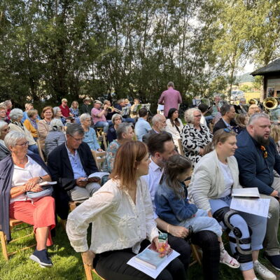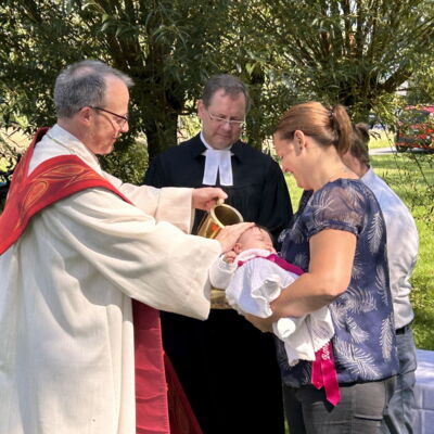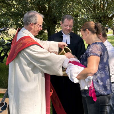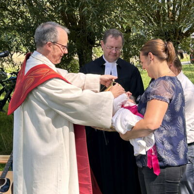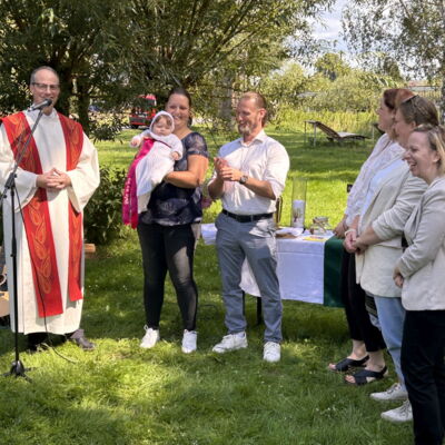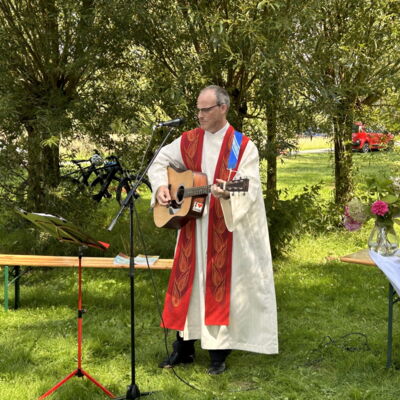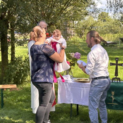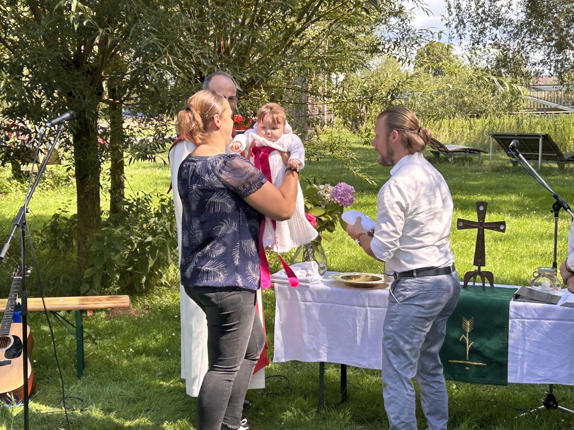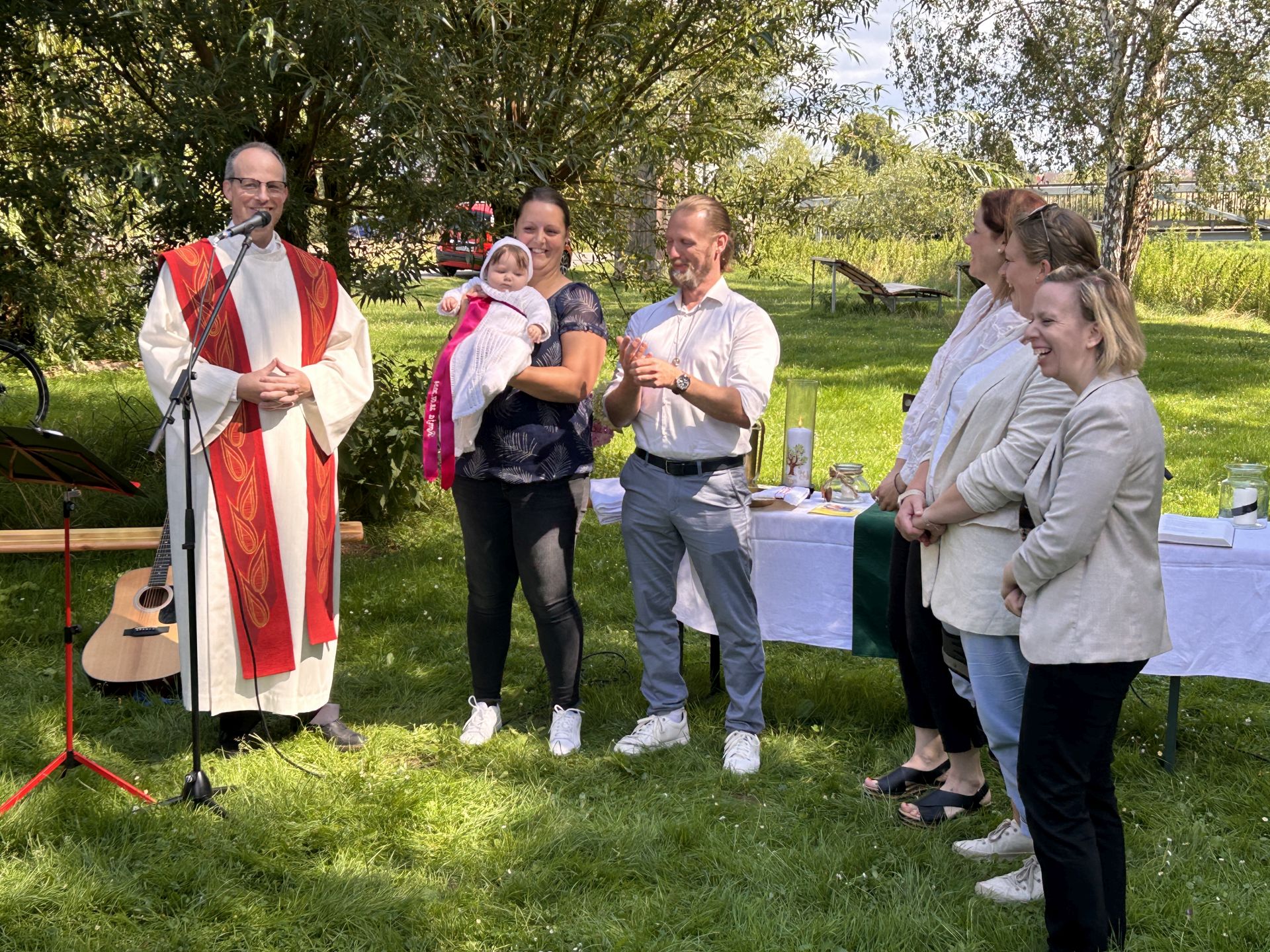 Pfarrer Gunnar Wirth eröffnete um 11.00 Uhr den Gottesdienst und konnte zu seiner Freude weit über 120 Gläubige begrüßen. Ein besonderes Ereignis war heute die Taufe eines Kindes, dass in der Gemeinschaft der Gemeinde mit Nethewasser getauft wurde. Die Taufe symbolisiert die Reinigung von Sünden und das neue Leben in Christus. Durch Musik und Gesang lobten die Anwesenden Gott. Nach dem Gottesdienst lud Pfarrer Gunnar Wirth zum Plausch bei Kaffee und Mineralwasser ein. Besonders Danke sagen wir allen Helferinnen und Helfern. Ohne eure Hilfe könnten wir so bewegende und schöne Gottesdienste in der freien Natur nicht feiern!
