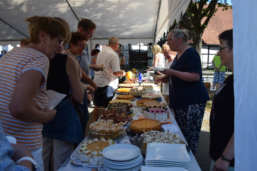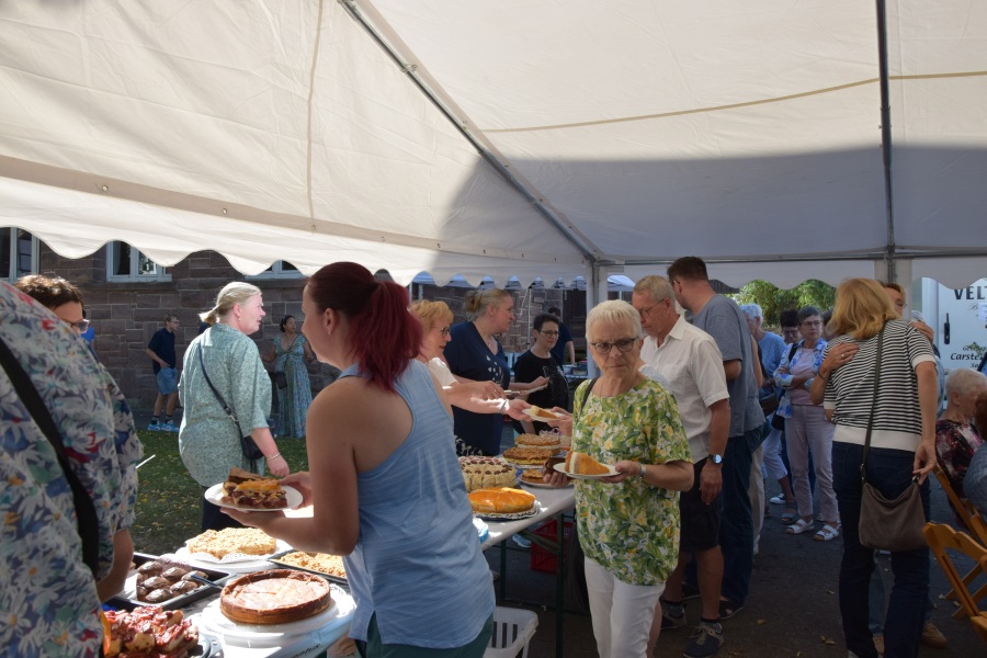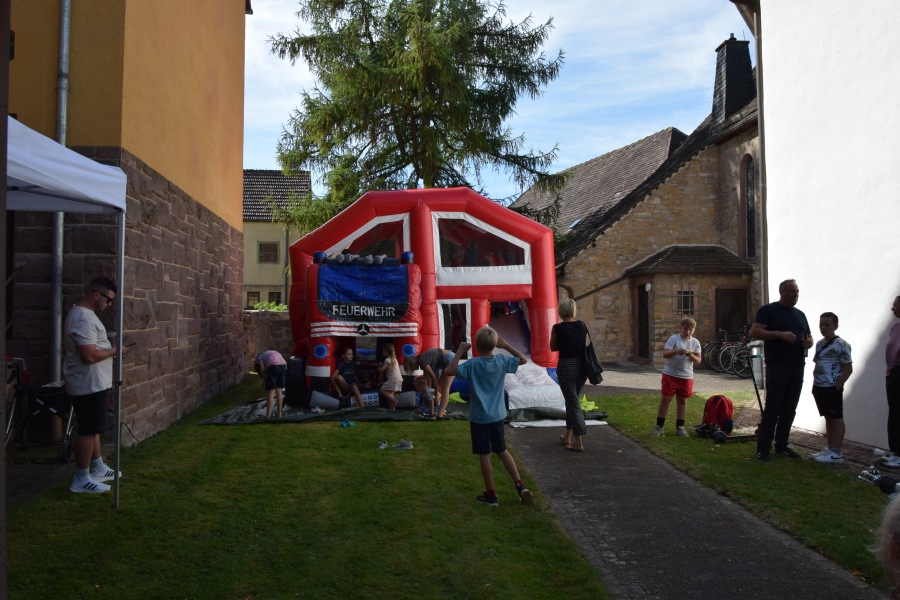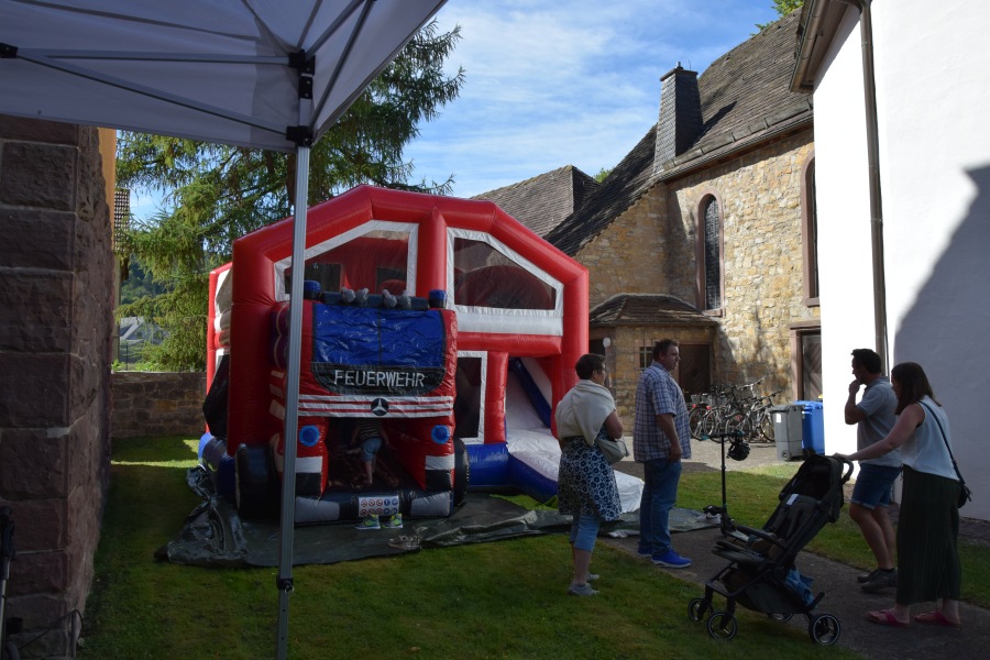 So gehen wir zwischen den aufgestellten Zelten hindurch. Ein großes für das Kuchenbuffet und mit zahlreichen Sitzmöglichkeiten, eines, wo später Bratwurst und Pommes angeboten werden sowie ein weiteres kleines mit gekühlten Getränken und Salaten. Ach ja, dahinter ist auch noch eine Hüpfburg, gar nicht mal so klein, zu erkennen. Aber halten wir uns nicht so lange auf, die Kirche ist schon gut gefüllt – Sie wollen ja noch einen guten Platz bekommen.