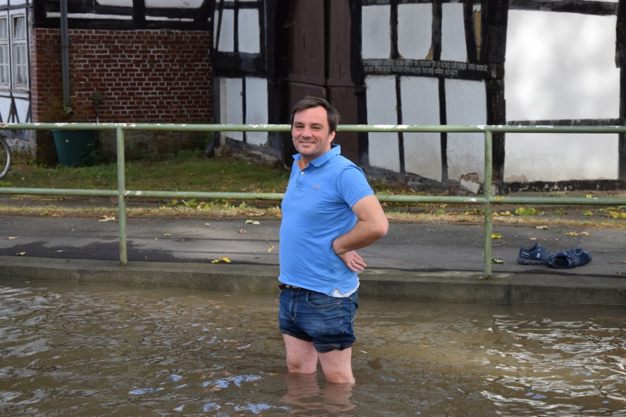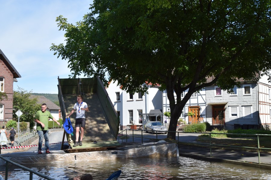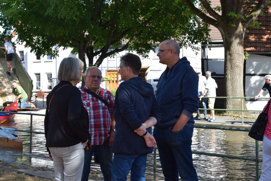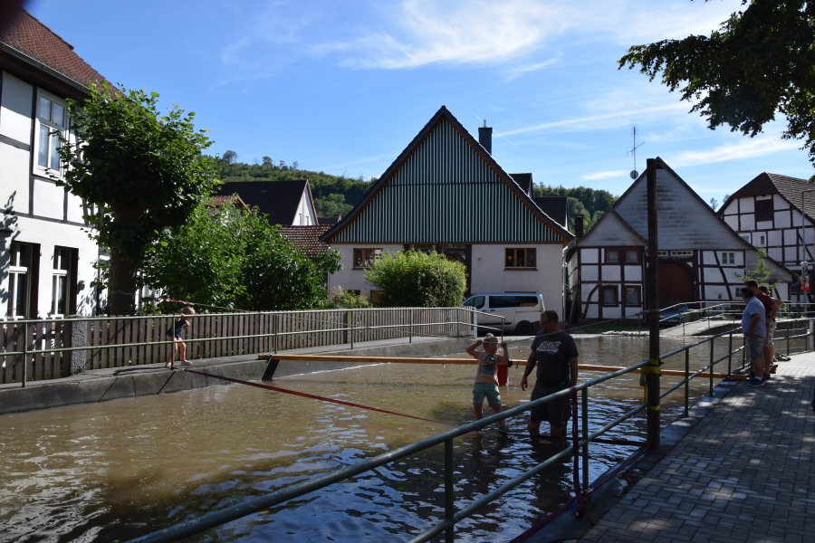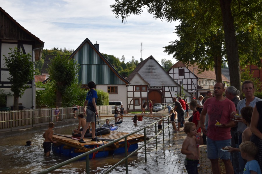 Ich nehme Sie, liebe Leserin und lieber Leser mit auf einen kleinen Spaziergang durch Bruchhausen. Kommen Sie, wir starten gemeinsam an der Nethebrücke, an dem sonnigen Sonntag, dem ersten im September dieses Jahres und schlendern das Kopfsteinpflaster der Hauptstraße so 120 Meter entlang, vorbei an einer Straßenabsperrung, bis wir 200 Meter weiter auf den Grund der Absperrung treffen. Unseren ganzen Weg lang begleiten uns links und rechts der Straße die bruchhausentypischen Gehwege, deren kniehohe Absturzkante durch ein Geländer gesichert ist. Und hier vor dem katholischen Kirchplatz haben eifrige Menschen für das heutige ökumenische Pfarr- und Gemeindefest einen Damm aus Strohballen zwischen den hohen Bürgersteigen quer über die Straße errichtet. Und ist dies noch nicht seltsam genug, haben die da die ganze Straße mit dem Wasser des Silberbachs geflutet. Ich lenke Ihren Blick auf die Wasseroberfläche, „damit ihr begreifen könnt, welches die Breite und die Länge und die Höhe und die Tiefe ist“. Nämlich Breite der Wasserfläche: 7,20 m; Länge: 70 m; Tiefe: bis 60 cm; Höhe der aufgestellten Pritsche: 4 m.