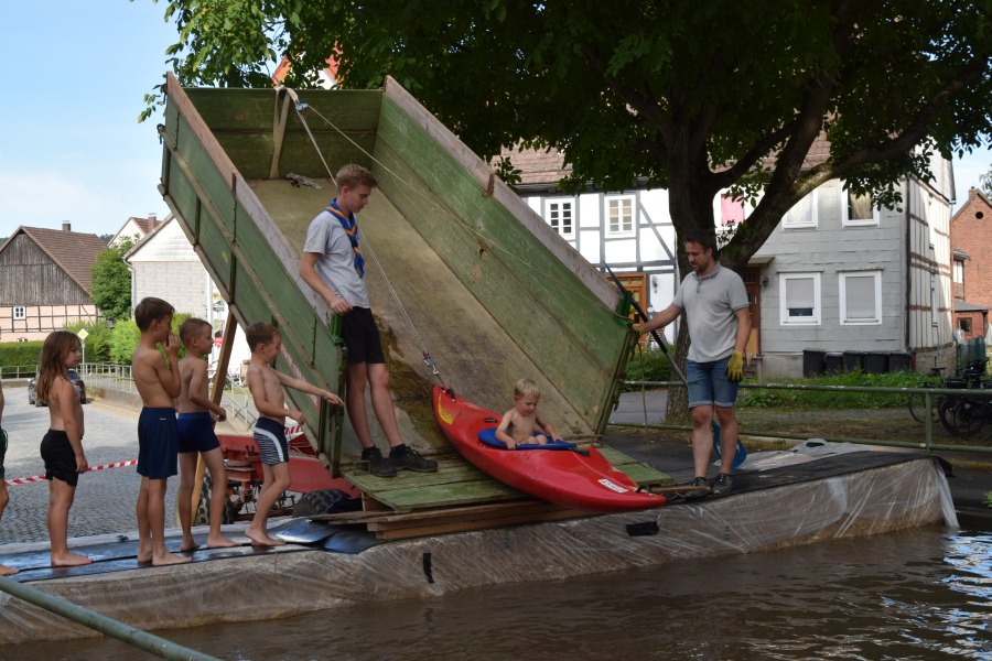 Und von dieser Pritsche startet wieder ein Kanu mit Schwung der Wasserfläche zu. Sie könnten es auch versuchen – doch ich höre schon Ihre Ausrede: Die gute Sonntagskleidung … sollen doch die Kinder … Es ist schon kurz vor zwei, die Glocken läuten bereits ... erst mal Gottesdienst.