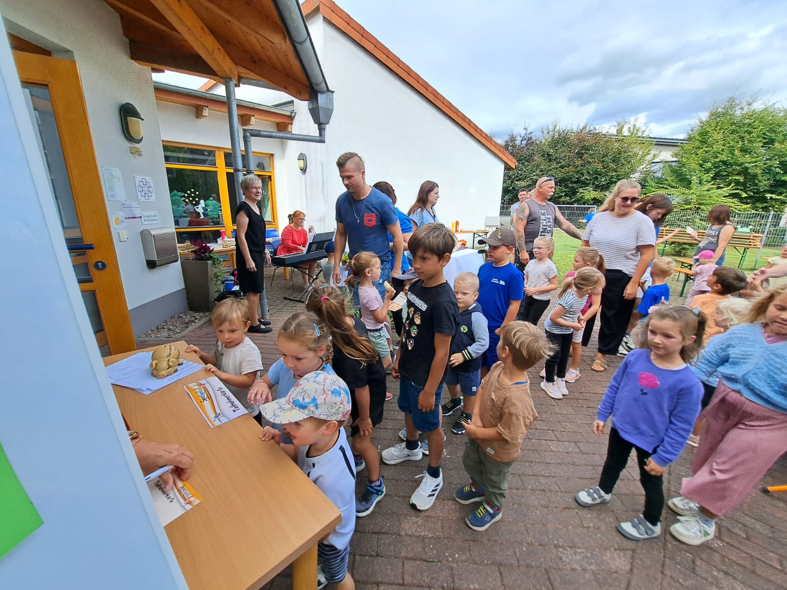 Gestartet wurde mit einem Gottesdienst mit Pfarrerin Astrid Neumann. Kindergartenleitung Sonja Krauke begrüßte danach alle und lud sie zu einer Aufwärmeinheit, mit verschiedenen Übungen wie z.B. dem Hampelmann ein.