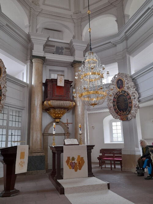 Bei der Kirche in Hehlen war das Gebäude faszinierend: Der erste protestantische Zentralbau, ein regelmäßiges, völlig symmetrisches Achteck. Innen wirkte die Kirche ganz intim und man mochte gar nicht glauben, dass (mit den Plätzen auf den Emporen) fast 300 Leute hineinpassen. Der Innenraum war lichtdurchflutet und kostbar ausgestattet.