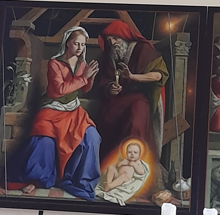 In Grave gab es dann ein Altarbild des berühmten modernen Kirchenmalers Michael Triegel zu sehen. Er gehört der sog. „Neuen Leipziger Schule“ an, malt auf den ersten Blick im alten Stil wie z.B. Cranach, fügt aber überraschende Momente ein. So hängt die Krippe im Mittelteil des Altarbildes an Seilen und auf dem linken Flügel erkennt man im Hintergrund den Köterberg. Auf der Rückseite, die Christus als Weltenrichter zeigt, symbolisieren Fische die ersten Christen.