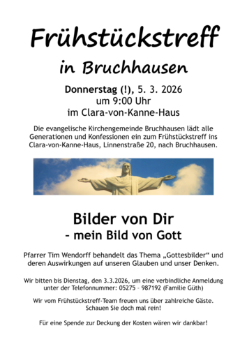 Der Bezirk Bruchhausen der Evangelischen Weser-Nethe-Kirchengemeinde Höxter lädt alle Generationen und Konfessionen zum Frühstückstreff am Donnerstag, 5. März 2026 um 9.00 Uhr ins Clara-von-Kanne-Haus, Linnenstraße 20 in Bruchhausen ein.