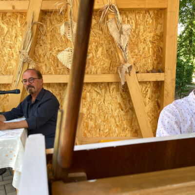 Das beiliegende Foto zeigt die beiden Künstler bei ihrer „Lyrisch-musikalischen Reise“ im Schöpfungsgarten am 25. Juni.