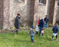 Nach dem Gottesdienst hatte der „Osterhase“ Eier um Kirche und Gemeindezentrum versteckt. Die Pfarrerin hatte ihn extra erst für den Ostermontag bestellt, um ihm die Arbeit zu erleichtern.