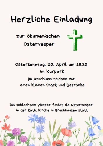 Am Ostersonntag findet in Bruchhausen um 18:30 Uhr im Kurpark eine ökumenische Ostervesper statt.