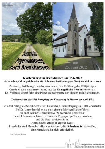 Ökumenische Pilgerwanderung nach Brenkhausen mit Dr. Wolfgang Unger zur Eröffnung des Klostermarktes um 10.00 Uhr.